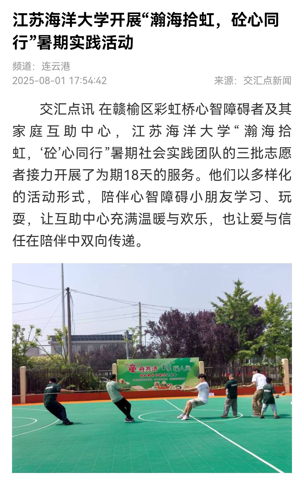 在赣榆区彩虹桥心智障碍者及其家庭互助中心,江苏海洋大学“瀚海拾虹,‘砼’心同行”暑期社会实践团队的三批志愿者接力开展了为期18天的服务。他们以多样化的活动形式,陪伴心智障碍小朋友学习、玩耍,让互助中心充满温暖与欢乐,也让爱与信任在陪伴中双向传递。