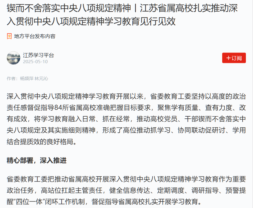 深入贯彻中央八项规定精神学习教育开展以来,省委教育工委坚持以高度的政治责任感督促指导84所省属高校准确把握目标要求,聚焦学有质量、查有力度、改有成效,将学习教育融入日常、抓在经常,推动高校党员、干部锲而不舍落实中央八项规定及其实施细则精神,形成了高位推动抓学习、协同联动促研讨、学用结合提质效的良好格局。