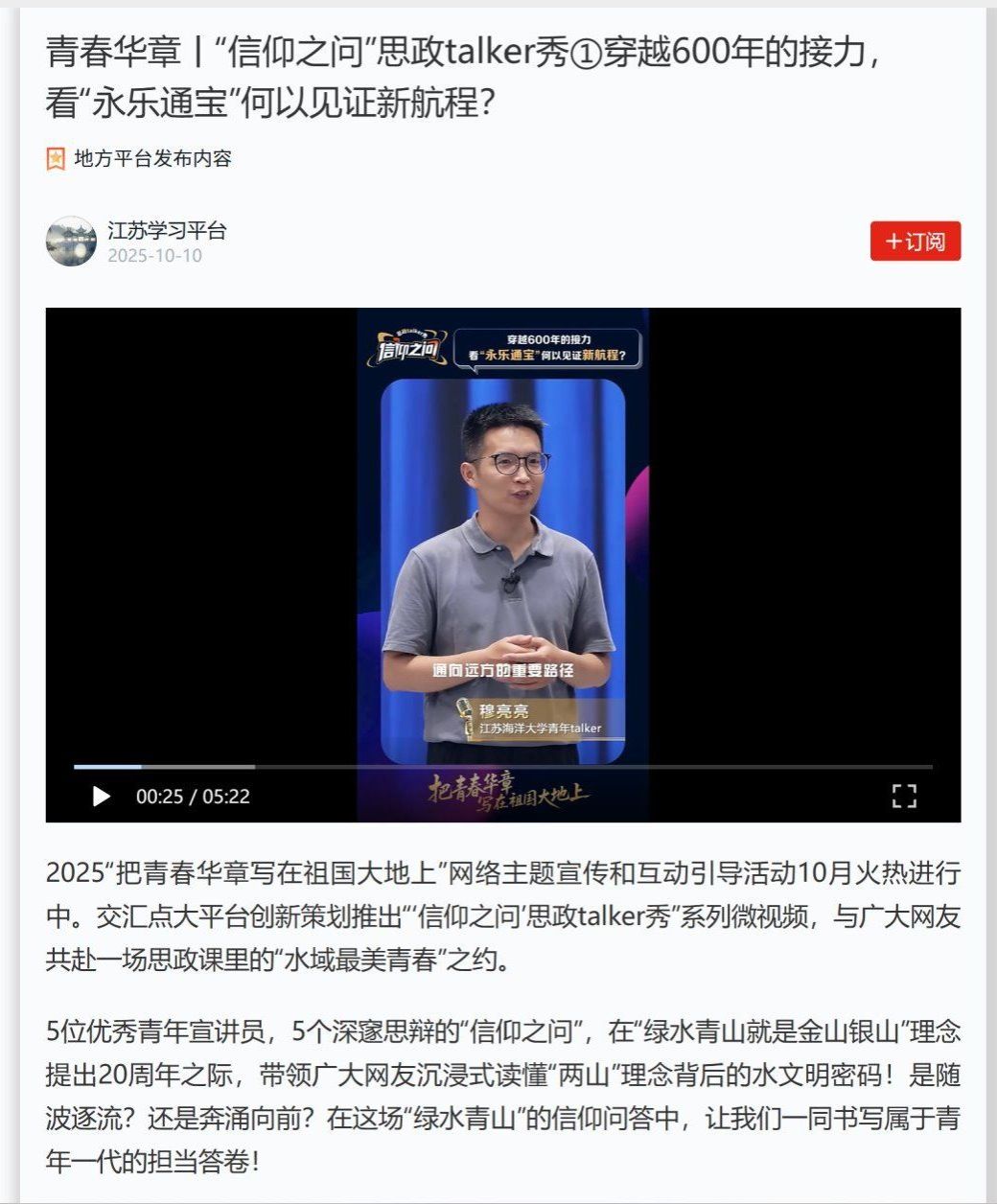 2025“把青春华章写在祖国大地上”网络主题宣传和互动引导活动10月火热进行中。交汇点大平台创新策划推出“‘信仰之问’思政talker秀”系列微视频,与广大网友共赴一场思政课里的“水域最美青春”之约。