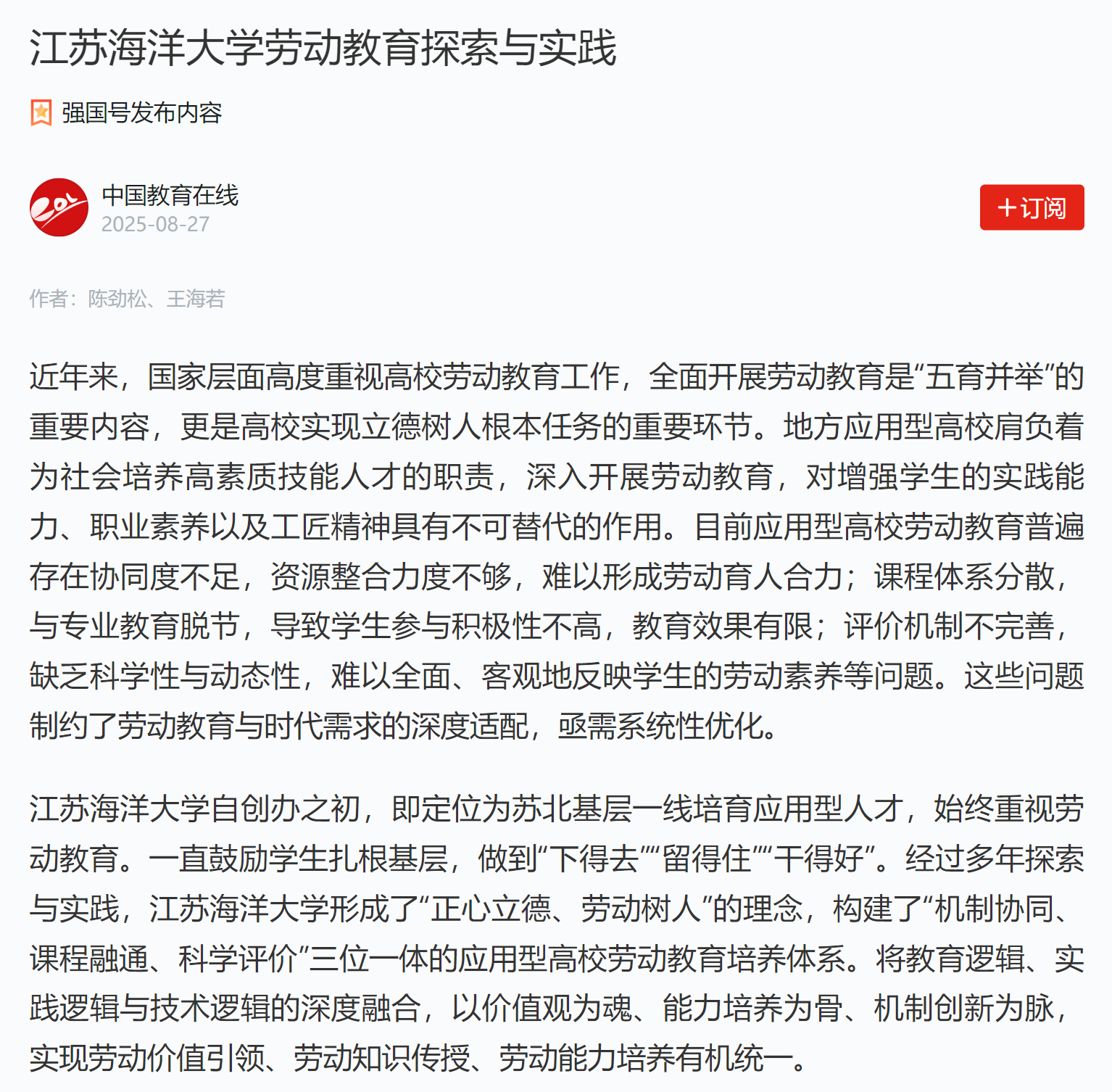江苏海洋大学自创办之初,即定位为苏北基层一线培育应用型人才,始终重视劳动教育。一直鼓励学生扎根基层,做到“下得去”“留得住”“干得好”。经过多年探索与实践,江苏海洋大学形成了“正心立德、劳动树人”的理念,构建了“机制协同、课程融通、科学评价”三位一体的应用型高校劳动教育培养体系。将教育逻辑、实践逻辑与技术逻辑的深度融合,以价值观为魂、能力培养为骨、机制创新为脉,实现劳动价值引领、劳动知识传授、劳动能力培养有机统一。