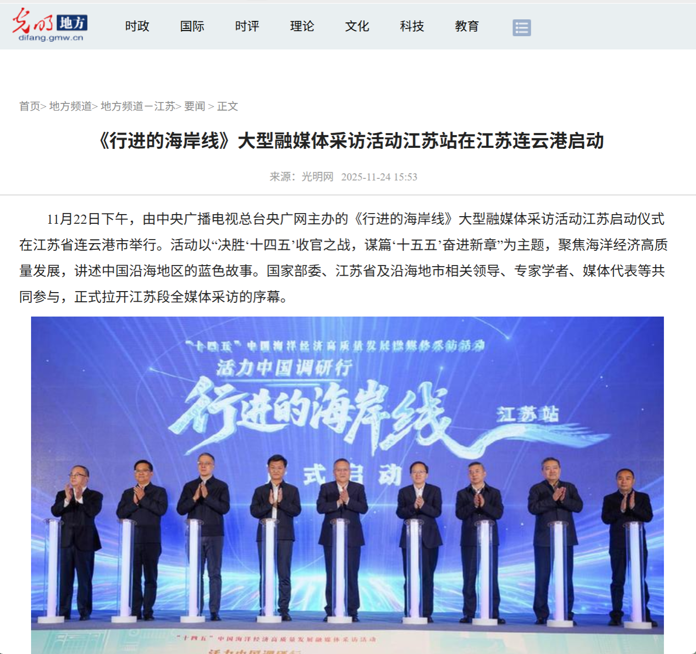 11月22日下午,由中央广播电视总台央广网主办的《行进的海岸线》大型融媒体采访活动江苏启动仪式在江苏省连云港市举行。活动以“决胜‘十四五’收官之战,谋篇‘十五五’奋进新章”为主题,聚焦海洋经济高质量发展,讲述中国沿海地区的蓝色故事。国家部委、江苏省及沿海地市相关领导、专家学者、媒体代表等共同参与,正式拉开江苏段全媒体采访的序幕。