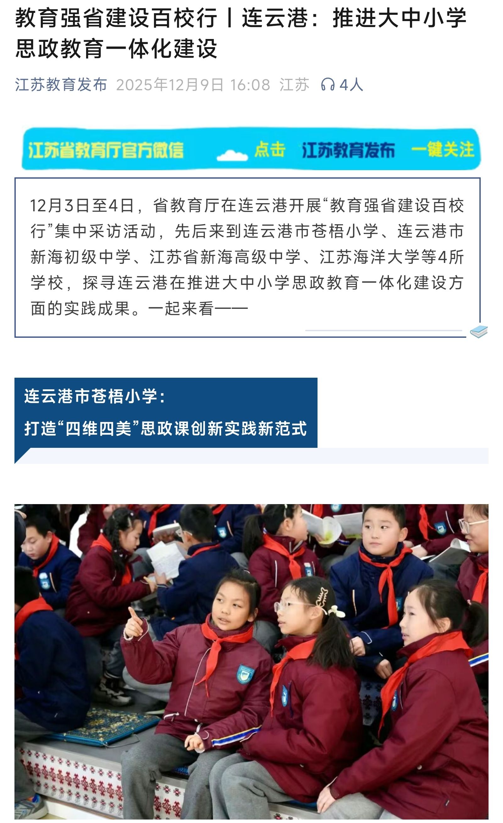 12月3日至4日,省教育厅在连云港开展“教育强省建设百校行”集中采访活动,先后来到连云港市苍梧小学、连云港市新海初级中学、江苏省新海高级中学、江苏海洋大学等4所学校,探寻连云港在推进大中小学思政教育一体化建设方面的实践成果。一起来看——