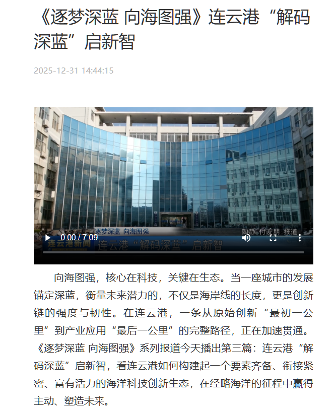 向海图强,核心在科技,关键在生态。当一座城市的发展锚定深蓝,衡量未来潜力的,不仅是海岸线的长度,更是创新链的强度与韧性。在连云港,一条从原始创新“最初一公里”到产业应用“最后一公里”的完整路径,正在加速贯通。《逐梦深蓝 向海图强》系列报道今天播出第三篇:连云港“解码深蓝”启新智,看连云港如何构建起一个要素齐备、衔接紧密、富有活力的海洋科技创新生态,在经略海洋的征程中赢得主动、塑造未来。