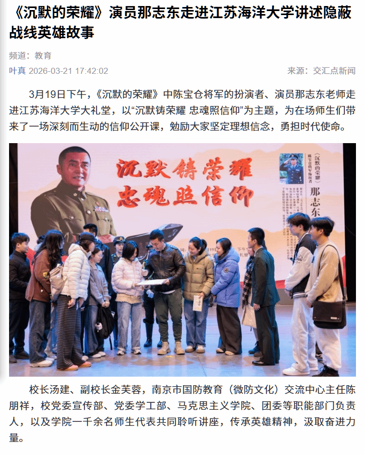3月19日下午,《沉默的荣耀》中陈宝仓将军的扮演者、演员那志东老师走进江苏海洋大学大礼堂,以“沉默铸荣耀 忠魂照信仰”为主题,为在场师生们带来了一场深刻而生动的信仰公开课,勉励大家坚定理想信念,勇担时代使命。