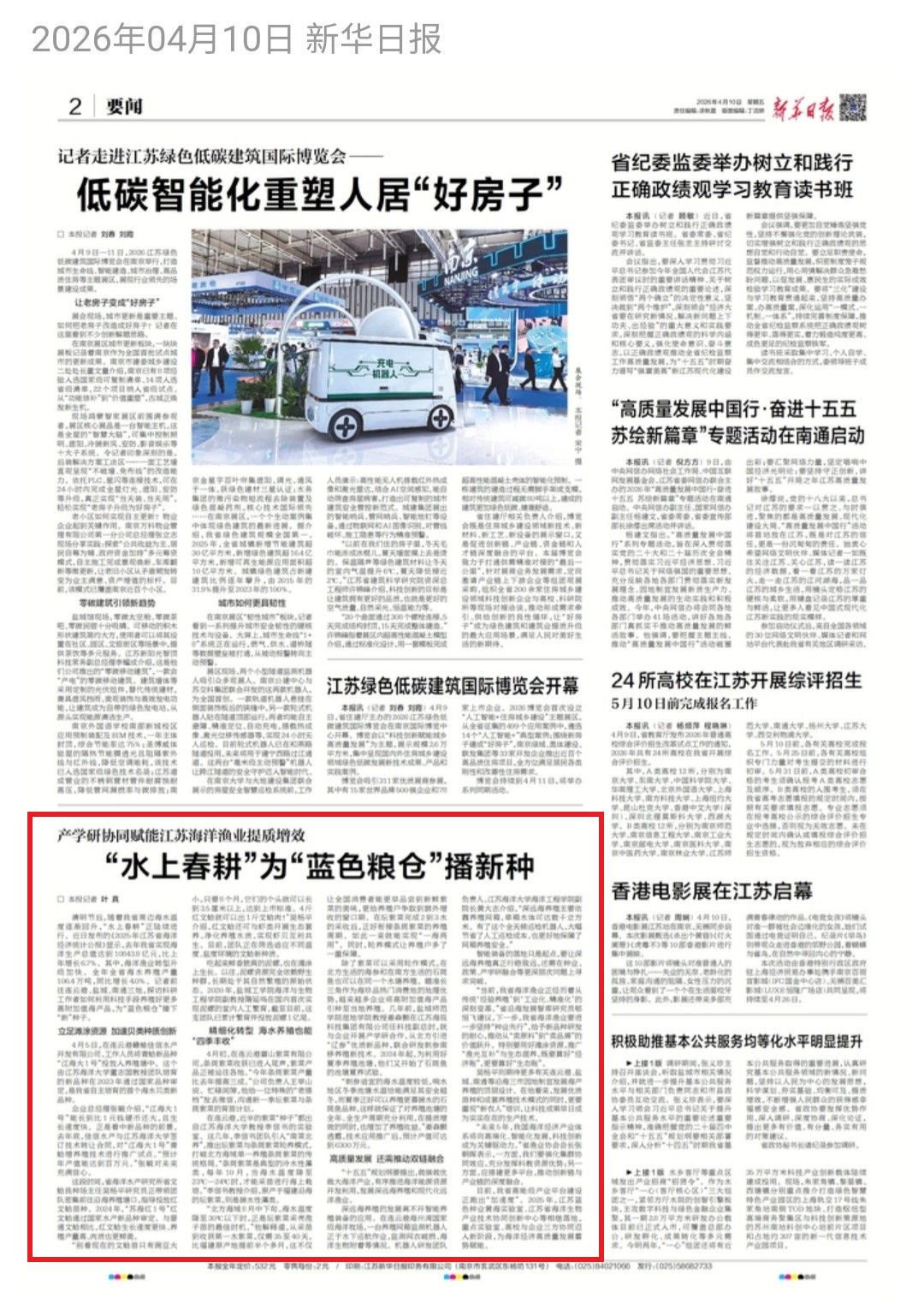 交汇点新闻:产学研协同赋能江苏海洋渔业提质增效 “水上春耕”为“蓝色粮仓”播新种