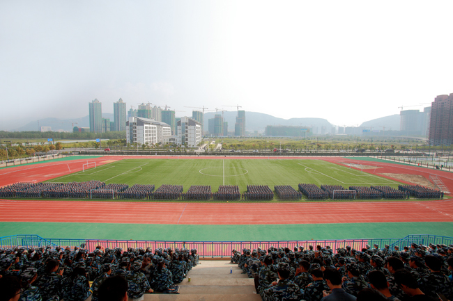 军训汇报在庄严的国歌中拉开序幕。1150余名新生组成的14个方队整齐列队,等待首长的检阅。史金飞校长在王如喜参谋长的陪同下,依次检阅各个方队。所到方队,受训学生整齐划一行注目礼,“首长好!”“为人民服务!”洪亮的口号在运动场四周回荡。