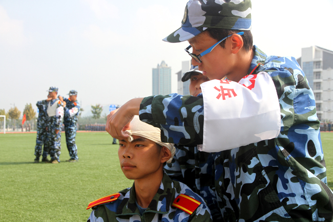 随后,2014年学生军训汇报表演正式开始。各连队选拔的200名优秀学员表演了军体拳,军训团直属救护队分队表演了战地救护表演,40名优秀学员参加了内务比赛,最后,全体方队进行分列式表演,受训新生军姿挺拔,迈着矫健的步伐走向主席台,接受与会领导和部队首长的检阅。他们坚定的步伐、整齐划一的队形、嘹亮的口号,彰显了2014级新生自强不息、报效祖国的壮志豪情和青春的蓬勃朝气。同学们动作准确、气势威武,赢得了热烈掌声。