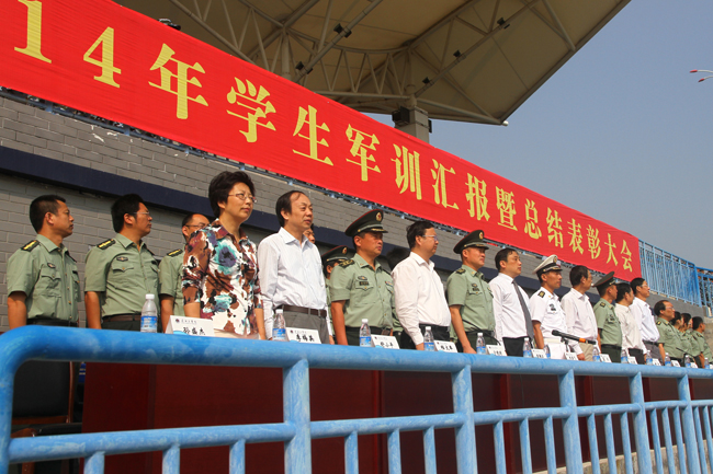 9 月20 日 上午,2014级新生军训汇报暨总结表彰大会在苍梧校区主体育场隆重举行,海军指挥学院、军训办公室主任蓝天大校、连云港警备区司令部作训科科长陈贻江中校、中国人民解放军73201部队政治处主任姚诚中校,新浦区人武部副部长程文举中校、校领导史金飞、刘永强、宁晓明、史顺良、舒小平、杜军、李梅英、王洪法出席并观看了军训团汇报表演。5000余名2014级新生及承训教官参加了军训汇报表演。大会由校武装部部长孙盛杰主持。