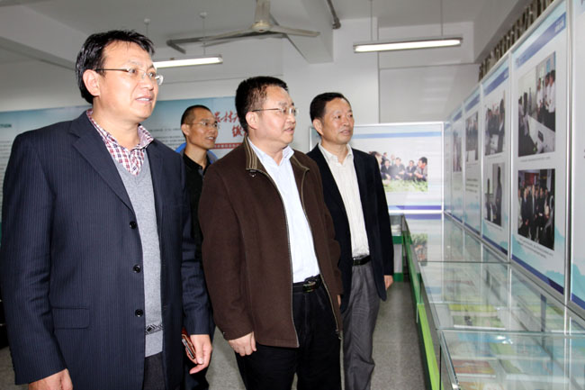 江苏省农林厅原厅长刘立仁在党委副书记、纪委书记史顺良的陪同下在大学生村官史料馆参观
