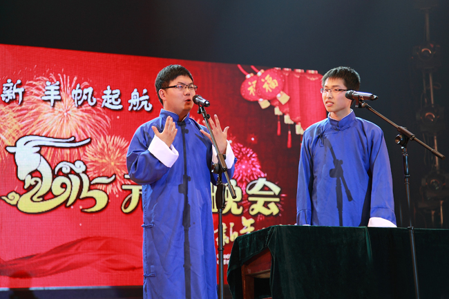 晚会在一段动感十足的劲舞中拉开了序幕。随后,由大学生艺术团器乐队演奏的《瑶族舞曲》给师生们带来一场听觉盛宴。舞台上一群身着黑色西装和黑色长裙的同学立于舞台中央,两名女生手持二胡,在前方老师的指挥下拉动琴弦,悠扬的曲调随即响起。随着长笛和三位琵琶少女的加入,演奏更加跌宕起伏。倏地,音乐轻快起来,一位男生神采奕奕地坐在钢琴旁,以优雅、娴熟的手法在琴键上灵活地飞舞。相声《我的小伙伴》,演员们诙谐的语言,扎实的台风,赢得了同学们阵阵掌声。“不要再逗留,人心太拥挤……”嘶哑、低沉的嗓音回荡在整个礼堂。高校好声音第四名的王谭用出色的唱功将歌曲中撕心裂肺的感情表达得淋漓尽致。大学生艺术团民舞队的同学身着飘逸的白色长裙,用优美的舞姿演绎的舞蹈《玉生烟》将晚会气氛推上了高潮。