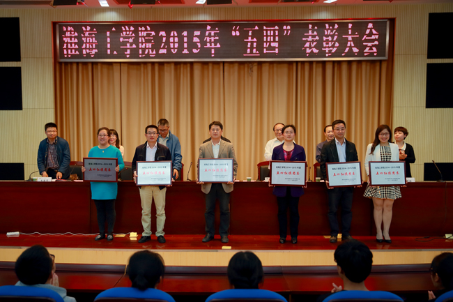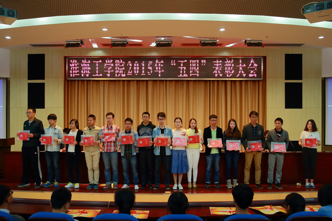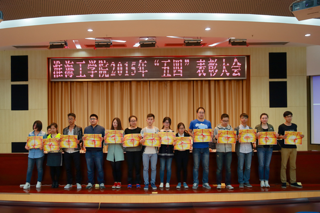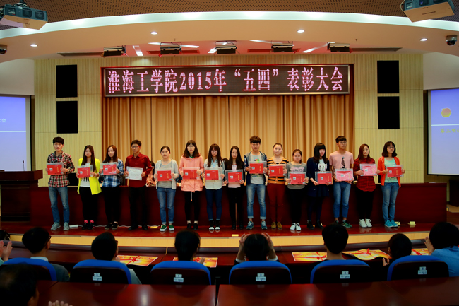 表彰大会在庄严的团歌声中拉开帷幕。校党委宣传部部长金芙蓉宣读了《关于表彰淮海工学院2014-2015年度五四红旗团委、共青团工作先进工作者、五四红旗团支部、优秀团干部、优秀团员的决定》。会议表彰了文学院团委等6个“五四红旗团委”,王晶等6名“先进工作者”、76个“五四红旗团支部”、“优秀团干部”202人、“优秀团员”1033人。与会领导为获奖集体和个人代表颁发了荣誉证书和奖状。