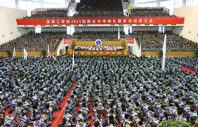 9月8日上午,淮海工学院2015级新生开学典礼在苍梧校区体育馆隆重举行。校领导赵炳起、史金飞、刘永强、宁晓明、史顺良、舒小平、杜军、王洪法出席典礼,各二级学院党政负责人、有关职能部门负责人、新生班主任、辅导员和全体2015级新同学参加了开学典礼。典礼由副校长王洪法主持。