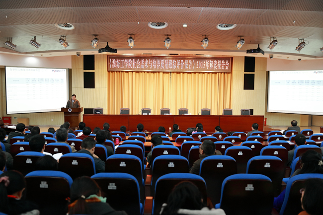 11月18日下午,我校在会议中心黄海厅召开《淮海工学院应届毕业生社会需求与培养质量跟踪评价报告》解读会,特邀麦可思数据有限公司副总裁吴垠博士对报告进行深度解读。校领导宁晓明、王洪法出席了报告会,全校中层干部、系主任、教务秘书、辅导员,以及教务处、教学质量管理处、学生处、团委等相关部门工作人员听取了报告,报告会由副校长王洪法主持。