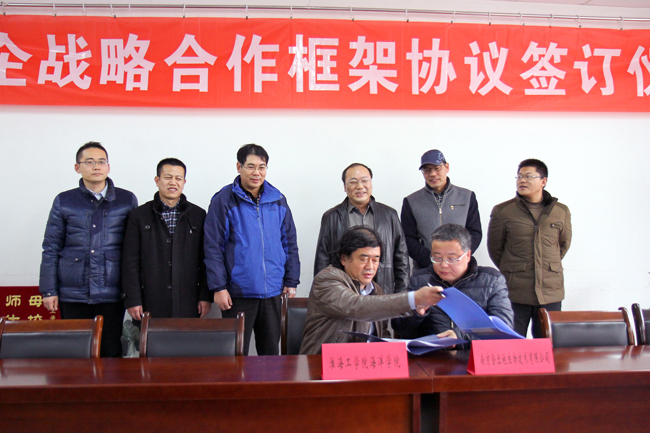 江苏天福莱集团有限公司董事长陈忆凤、人力资源部经理马树建;南京金土地生物技术有限公司总经理朱春峰、副总经理唐向阳,淮海工学院副校长王洪法及海洋学院党政领导出席了本次签约仪式。