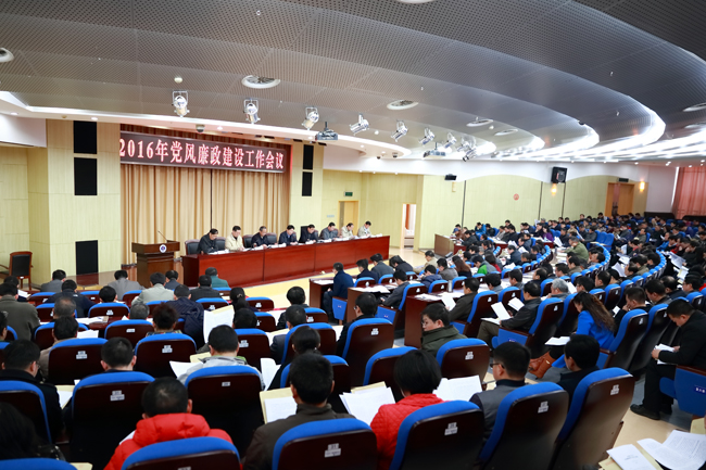 3月23日下午,我校在会议中心黄海厅召开2016年党风廉政建设工作会议,部署学校全面从严治党和党风廉政建设及反腐败工作。校党委书记赵炳起出席会议并讲话,校党委副书记、纪委书记史顺良作工作报告。全体校领导,中层干部,各基层党组织纪检委员、特邀监察员,各单位、部门的科长、副科长共340余人参加了会议。会议由校长史金飞主持。
