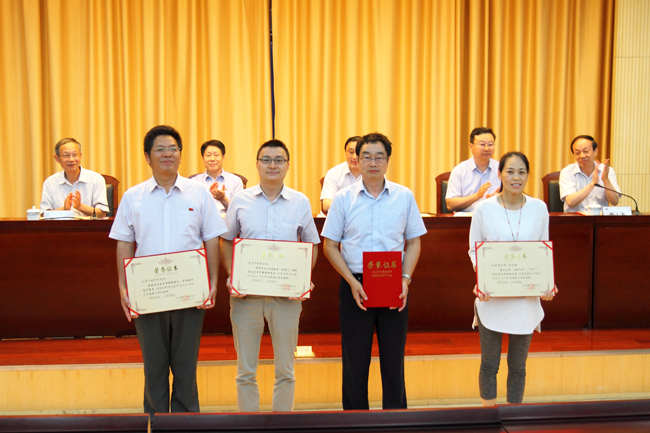 出席大会的校领导为受表彰的单位及个人颁奖。