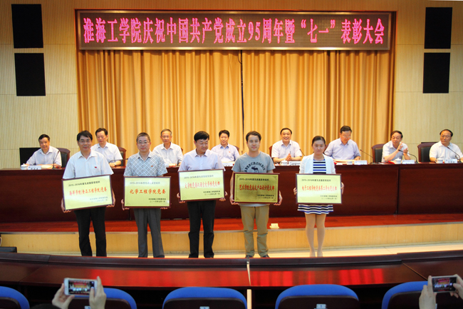 党委副书记、副校长宁晓明同志宣读《中共淮海工学院委员会关于表彰优秀共产党员、优秀党务工作者和先进基层党组织的决定》。党委副书记、纪委书记史顺良同志宣读了《中共淮海工学院委员会关于公布2015-2016年度“最佳党日活动”和党建工作创新奖的通知》。王寿武等25位同志被授予优秀共产党员荣誉称号;马志同等5位同志被授予优秀党务工作者荣誉称号;海洋学院(食品工程学院)党委等5个基层党组织被授予先进基层党组织荣誉称号;化学工程学院党委等4个单位获党建工作创新奖;药学院党总支等9个单位获最佳党日活动奖。