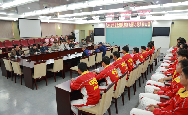 2016年校龙舟队参加全国比赛获得优异成绩,10月26日下午,表彰大会在会议中心东海厅隆重举行。校领导史金飞、宁晓明出席会议,教务处、学生处、团委、体育学院等部门负责人以及校龙舟队教练员、运动员参加表彰大会。