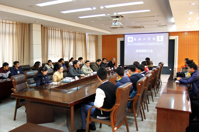 淮海工学院2016年度防控艾滋病宣传月总结表彰大会于12月29日下午在文渊楼二楼会议室召开,副校长许兴友出席会议,后勤管理处、党委宣传部、校团委等部门负责人和相关科室负责人及学生代表参加了会议。