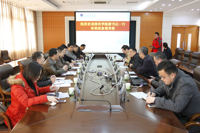 3月15日上午,广西梧州学院党委书记唐耀华、副校长林基明及数据云中心梁文忠等一行来我校调研智慧校园建设工作。校长史金飞、副校长刘永强、党委副书记、纪委书记史顺良在文渊楼会议室会见了来访客人。