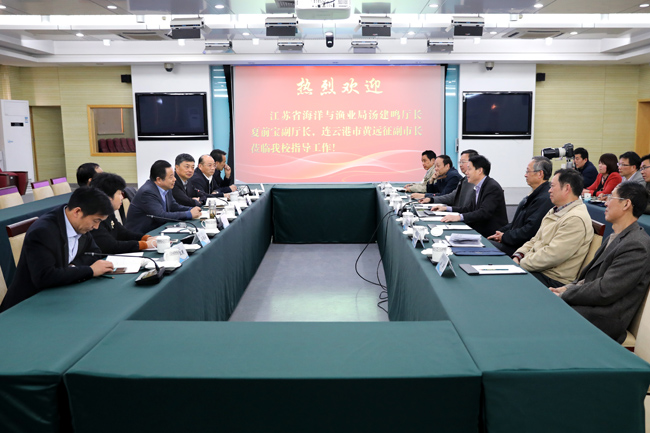 4月1日下午,省海洋与渔业局局长汤建鸣、副局长夏前宝一行来访我校。连云港市副市长吴海云、黄远征,市海洋与渔业局局长桂迎宝等人陪同。