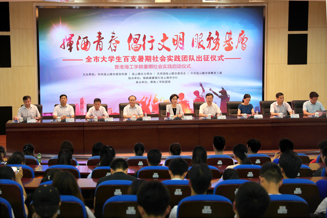 6月27日,连云港市“挥洒青春·倡行文明·服务基层”全市百支暑期社会实践团队出征仪式暨我校社会实践启动仪式在苍梧校区会议中心黄海厅隆重举行,连云港市委常委、宣传部长滕雯,团市委书记曹明丽,市文明办副主任吴克典、市委教育工委副书记田文瑞、团市委副书记仲伟德,我校党委副书记、副校长宁晓明,副校长王洪法出席会议,市委宣传部副部长周玉久主持会议,全市大中专院校师生代表300余人参加了出征仪式。