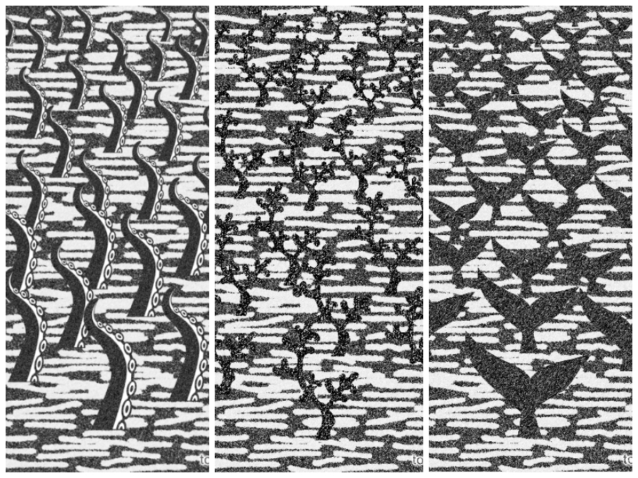 这组海报运用版画版刻的形式表现海洋,黑白色调寓意着死亡,借用倒三角的不稳定性,利用章鱼触手、珊瑚、鱼尾的倒三角式排列,表现出一片海洋墓碑,警示人们要保护海洋。