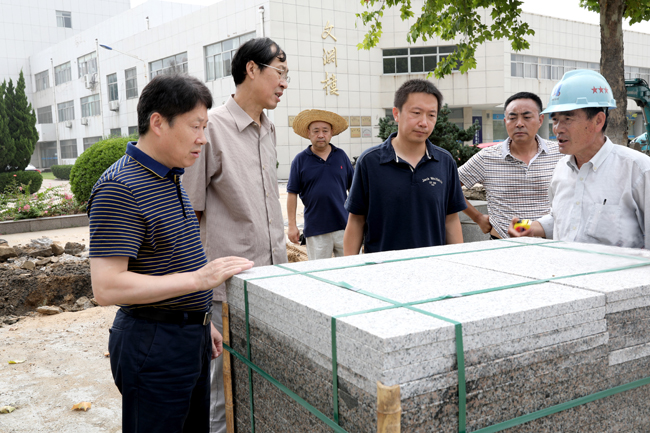在通灌校区,赵炳起、杜军一行先后来到明德楼、至善楼,深入教师休息室、中心广场景观改造等施工现场,重点询问了学生宿舍风扇安装、食堂卫生安全等关系学生生活的工程进展情况;在宋跳校区,宁晓明、许兴友先后前往教学楼、学生浴室、学生食堂等维修改造工程现场;在苍梧校区,校领导一行视察了校园“白改黑”工程现场、在建中的海洋工程技术实验中心,并到学生宿舍区查看桌椅橱柜维修、更换情况。每到一处,校领导对放弃暑期休息,在酷暑中坚守在一线的职工表示亲切慰问和衷心感谢,并向相关负责同志详细了解工程推进情况,询问施工过程中是否存在困难,商讨解决方案和提出整改意见。
