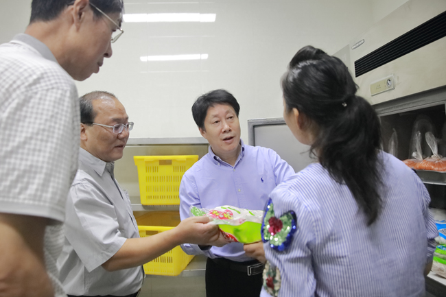 在苍梧校区东区,赵炳起、宁晓明一行察看了教学设备安装情况以及食堂开学准备情况,要求后勤、基建、资产、物管等部门多方协作,加强施工细节管理,尽快完成收尾工作;要求饮食服务公司广大干部职工认真做好餐厨设备清洁消毒工作,控制成本,稳定菜价,保证食品安全。