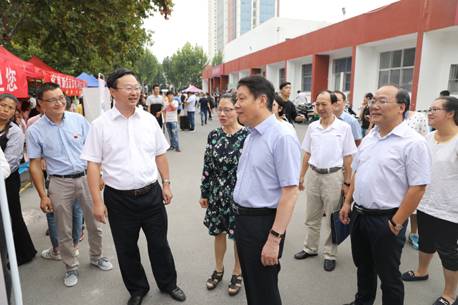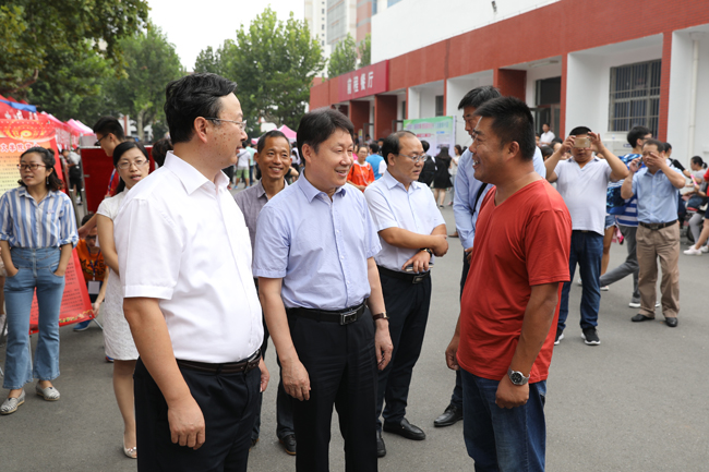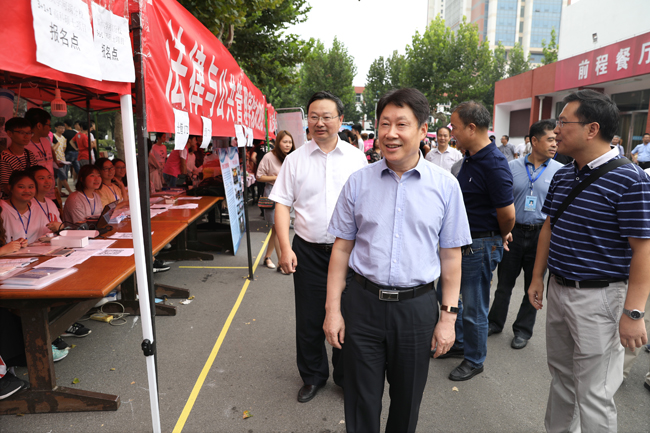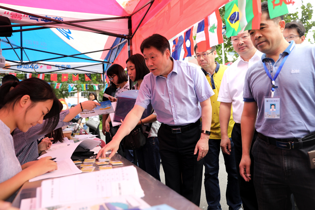 上午,校领导一行首先来到通灌校区各学院新生接待处,向迎新工作人员和学生志愿者详细了解迎新工作进展情况。听闻各学院新生报到人数都已超过80%,校领导很高兴,对大家的辛勤劳动表示慰问和感谢,对迎新工作中呈现的亮点予以了点赞。在外国语学院新生报到处,校领导仔细查看了该院在接待处帐篷边缘设计的万国旗,连声称赞:“很有外国语学院特色!”在理学院迎新点,校领导停下脚步仔细观看该院班主任及辅导员公示牌,听取相关负责人有关新生辅导员的安排情况,得知新生班主任中有一位是刚进校的博士,风趣地说:“小伙子很帅呀,肯定很受女孩子们的欢迎!”引得现场人群发出一片欢笑声。在药学院迎新点,校领导仔细听取该院领导有关专业设计、新招学生人数、毕业生工作的汇报,得知毕业生在市场上供不应求,非常高兴,欣然在该学院设计的签名墙上留下了签名。