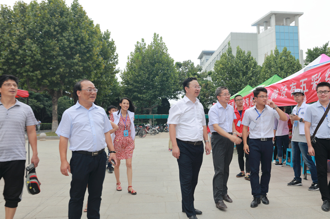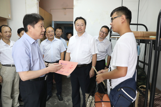 9月9日是我校2017级新生来校报到的高峰日,校园里处处洋溢着喜迎新生的热烈气氛。虽已入秋,天气依旧炎热。上午9点和下午2点,校党委书记赵炳起、校长宁晓明、副校长王洪法一行先后来到通灌校区、苍梧校区新生报到现场,看望来自祖国各地的2017级新同学和家长,亲切慰问为迎新工作紧张忙碌的师生和工作人员。