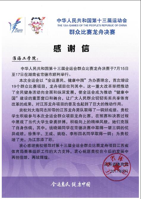 近日,江苏省体育局专门发来感谢信,就我校大力支持并积极参与第十三届全运会群众比赛龙舟项目表达谢意。