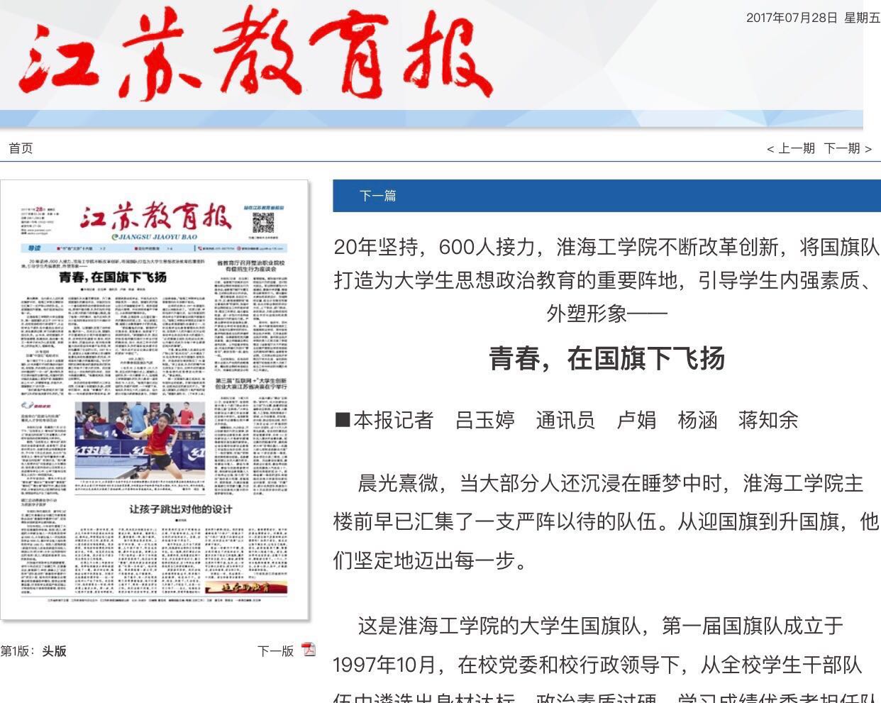 二十届的积累、付出与奉献,国旗队已成为淮海工学院爱国主义教育的示范岗,受到相关部门的关注和肯定。国旗队曾获校级先进团支部、优秀学生组织等荣誉称号,在百校国旗练兵比赛中获三等奖,省“高等学校学生教育管理奖”,相关事迹被列入省“大学生思想政治教育优秀案例”。今年7月,《江苏教育报》也在头版头条,为国旗队做了全面报道。在国旗队这一大熔炉中,队员们也获得了综合素质的拓展和个人能力的提升。毕业的数百名队友们,都在各自的工作岗位上取得了骄人的成绩。在各界师生的共同关爱下,国旗队度过了硕果累累的二十年。值得期待的是,在淮工精神的感染下,在国旗队精神的传承中,国旗队后劲有力,将以更火热的激情,续写更精彩的篇章。