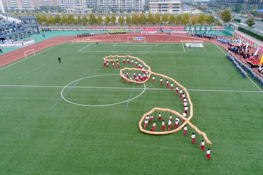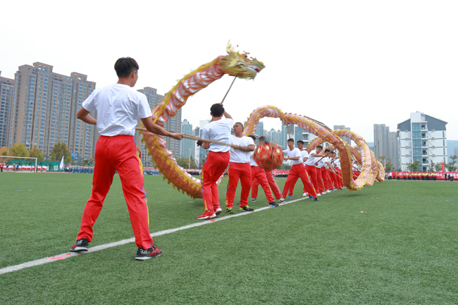 与往年不同,今年校运会组委会在开幕式之前精心安排了暖场表演。伴随着主持人慷慨激昂的介绍,一条金龙从操场左侧腾跃而出。来自体育学院休闲体育专业的52名同学手举长龙,成列奔跑在操场中央,长龙随着他们的动作不断升腾、盘旋,时而抬头直冲云霄,时而蜿蜒潜入海底,精彩的演出令现场观众赞叹不已,纷纷拍照录像。来自韩国、日本、巴基斯坦、吉尔吉斯斯坦、俄罗斯等国的留学生们以剑术配合扇舞进行表演,并用毛笔现场书写“明月入淮、千里同好”八个大字,表达了留学生们对淮海园、对中国文化的喜爱之情。随后进行的健身操表演、绸扇表演、高脚表演等节目,不仅让观众们眼前一亮,也展示了我校师生热爱运动、拼搏奋进的风采。