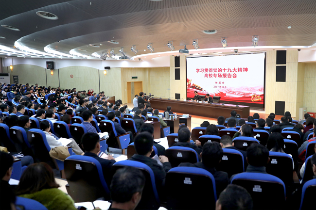 11月初,学校党委在会议中心东海厅召开会议,专门就学习宣传贯彻党的十九大精神工作进行部署。校党委书记赵炳起在会上强调:“认真学习宣传贯彻党的十九大精神是当前和今后一个时期学校的头等大事和首要政治任务。全校各级党组织要精心组织、周密部署,迅速兴起学习宣传贯彻党的十九大精神的热潮,切实把广大党员干部群众的思想和行动统一到党的十九大精神上来。”会议还对学习宣传贯彻十九大精神任务进行了部署,逐项明确了学习宣传贯彻19项重要任务的具体内容和责任部门。