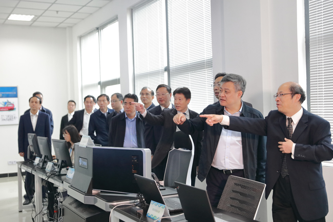 在海洋工程技术中心的海洋测绘水池和海洋动力水槽前,王江副省长详细了解了中心的建设情况和基本功能,并兴致勃勃地观看了研究人员关于人工造浪和水下机器人的现场演示。在海洋智能装备研究院,通过高清大屏,研究人员向王江副省长介绍了海洋无人艇在环保监测、科研勘探、水下测绘、搜索救援等领域可以发挥的作用。王江副省长对学校整合学科资源,聚焦海洋科技前沿,打造海洋优势学科的做法表示肯定。