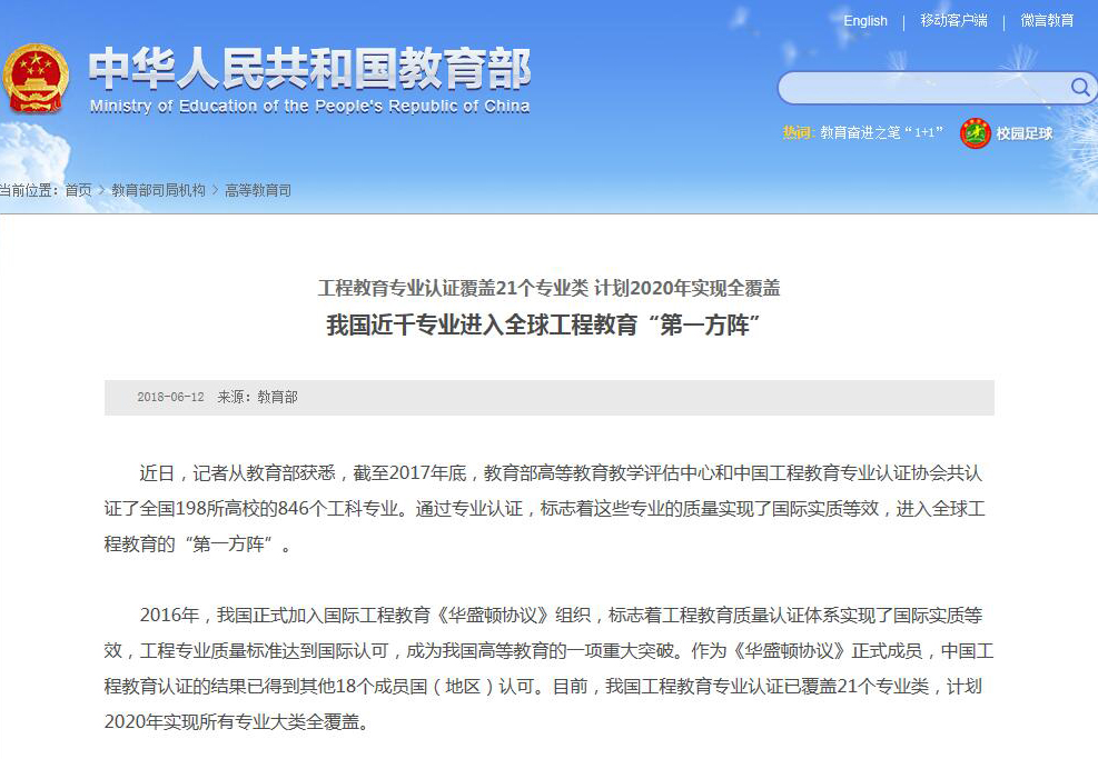 2016年,我国正式加入国际工程教育《华盛顿协议》组织,标志着工程教育质量认证体系实现了国际实质等效,工程专业质量标准达到国际认可,成为我国高等教育的一项重大突破。作为《华盛顿协议》正式成员,中国工程教育认证的结果已得到其他18个成员国(地区)认可。目前,我国工程教育专业认证已覆盖21个专业类,计划2020年实现所有专业大类全覆盖。