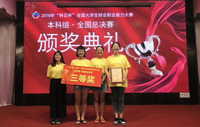 7月15日,由中国商业会计学会主办、厦门科云信息科技有限公司承办的2018年“科云杯”全国大学生财会职业能力大赛(本科组)全国总决赛在厦门集美大学财经学院落下帷幕,由商学院组建的我校代表队在骆阳、薛淑娟两位指导老师的带领下,亮剑群雄,荣获团队三等奖。