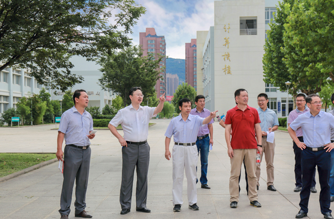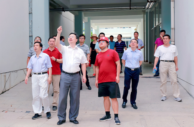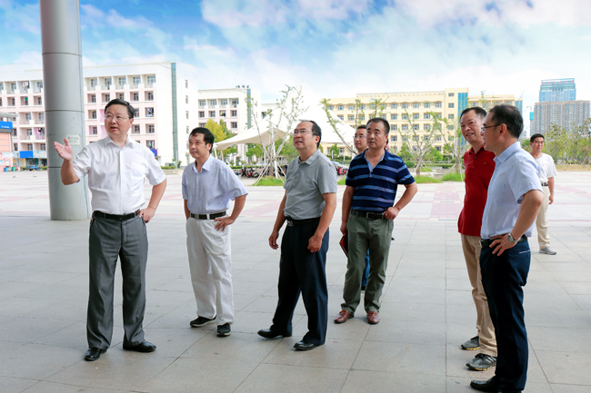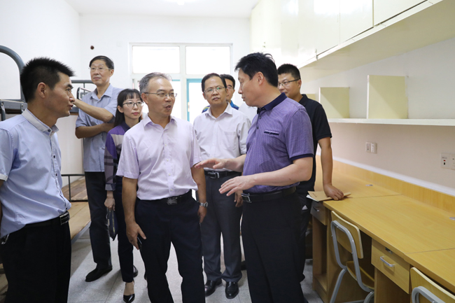 在苍梧校区,宁晓明、史顺良、许兴友、陈先宏一行先后视察了图书馆、教学主楼、文通楼、第四教学楼、风味餐厅、教工餐厅、校园道路“白改黑”现场以及A区、B区、D区学生宿舍,听取了相关人员对暑期工作进展情况的汇报,详细了解并查看教材准备、消防控制系统运行、教学设施维修改造、餐厅营业准备工作、学生宿舍家具换新及卫生间维修改造等情况,并对校园环境整治等提出指导性意见。宁晓明要求,相关单位和部门要针对检查中发现的问题,尽早拿出解决方案并及时解决,保障新学期开学各项工作平稳有序运行,努力为广大师生创造一个良好舒适的学习、工作和生活环境。