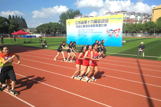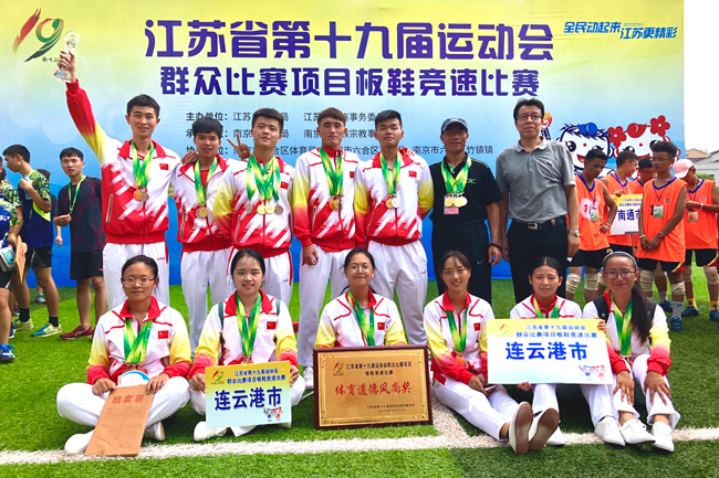 8月30日上午,江苏省第十九届运动会——群众比赛项目板鞋竞速比赛,在南京市六合区开幕。经过两天的激烈角逐,代表连云港市参赛的我校学生板鞋队获得3枚金牌,4枚银牌,1枚铜牌和1项第六名,并获得团体总分第一名和体育道德风尚奖,在全省设区市中获奖最多,总分比第二名高出53分之多。