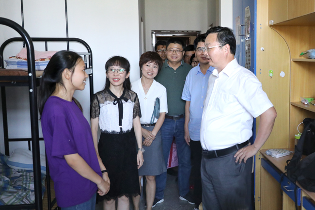 9月1日,是今年新生报到的“正日子”。当天下午,校长宁晓明、副校长金芙蓉,顶着烈日,先后前往苍梧校区、通灌校区新生宿舍,亲切看望慰问部分2018级新生,并为他们送去生活用品和慰问金。