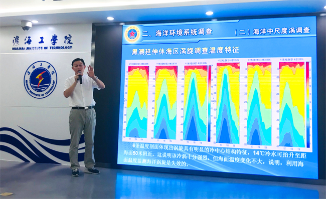 陈希为我校师生作了题为《军事海洋环境调查技术及应用》的学术报告。陈希通过形象生动的案例,图文并茂地阐释了海洋环境对军事安全的影响,并介绍了团队开展的海洋环境探测装备、定量评估分析等研究取得的进展和成果。报告既有理论高度,又有应用实例,赢得了与会师生的阵阵掌声,也激发了大家对运用海洋环境调查相关技术手段研究海洋的兴趣。