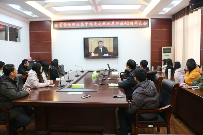 上午9点50分,在会议中心东海厅,全体校领导、“两委”委员、党群系统部门负责人、各二级党组织负责人50余人提前汇聚一堂,集中收听收看央视庆祝改革开放40周年大会直播。