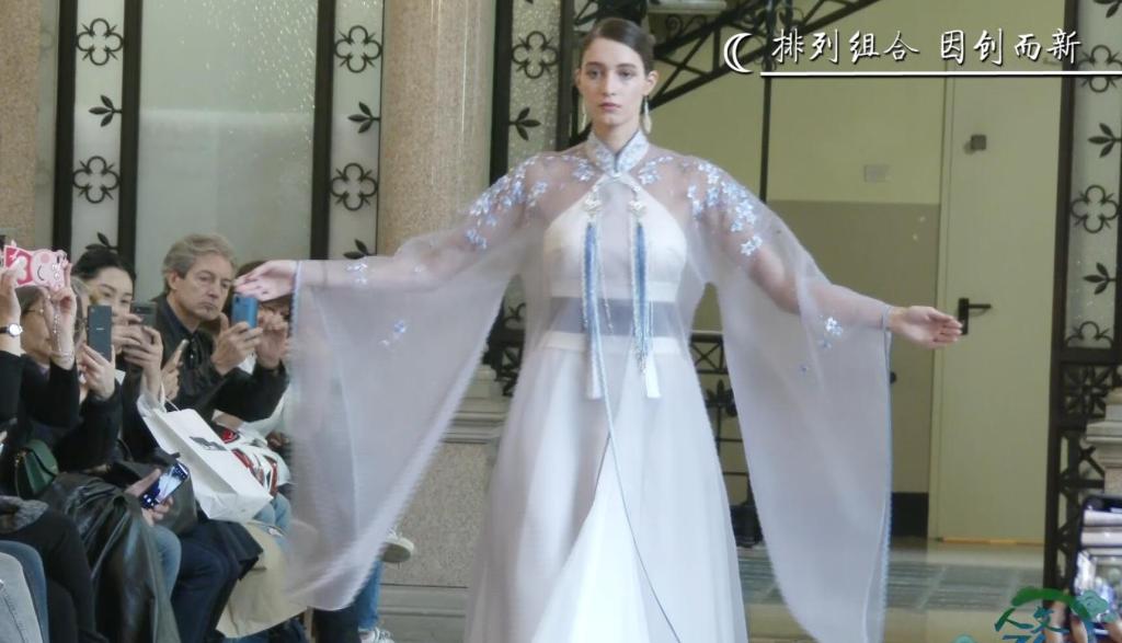 嫣红曳地丝锦裙,月白水纹流纱裙,双面手工苏绣团扇……一袭袭华贵、清雅、端庄、柔美的华服,衬托着金发碧眼的模特婀娜的身姿,柔光氤氲中尽显东方风情,全场观众为之惊艳。