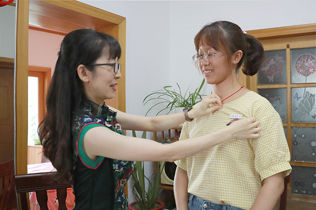 金芙蓉送上书包、行李箱等学习生活用品,并将一枚印有“江苏海洋大学”字样的白底红字校徽别在王馨怡胸前,笑着对她说,“你很幸运,这是江海大的第一枚校徽。”