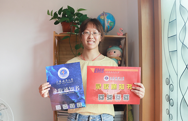 王馨怡同学兴奋地展示自己的录取通知书