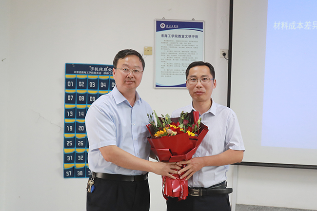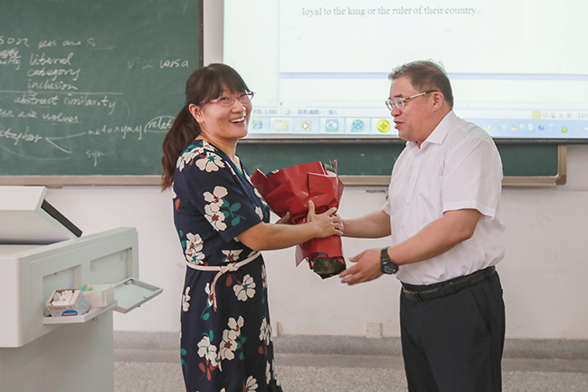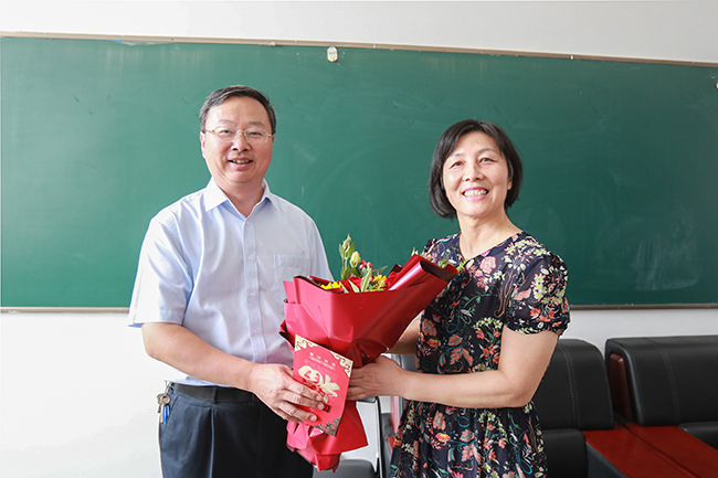 早晨8:30,第一节课刚下课,校党委书记王自力来到文通楼114教室,向正在这里上课的英语教师龚玉苗送上鲜花,他握着龚老师的手深情地说,外语一线教师课很多,特别辛苦,感谢你的敬业和坚守,祝你节日快乐。