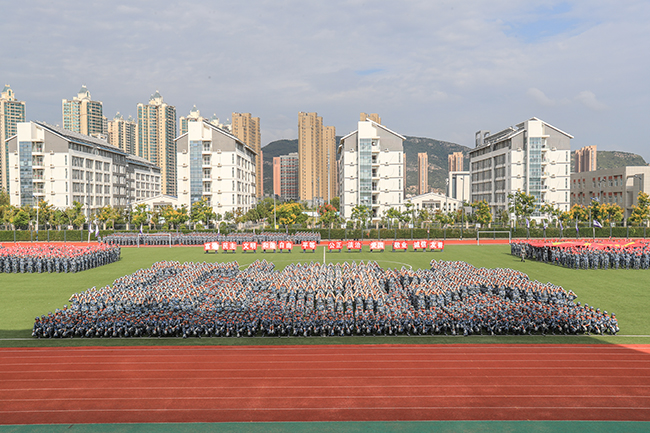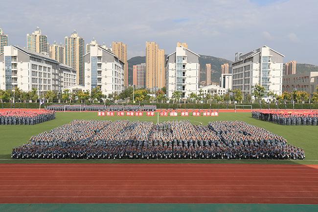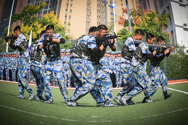 随后,举行了受训方阵分列式表演。各受训方阵以饱满的精神、高昂的斗志、嘹亮的口号、整齐的步伐、恢宏的气势依次走过主席台,接受与会领导和部队首长的检阅。军训学员结合建国70周年的主题,开展了千人特色方阵表演,部队教官进行了特种战术表演,学生表演方队还进行了军体拳等军事技能汇报表演。