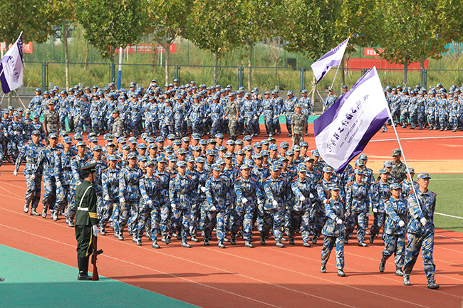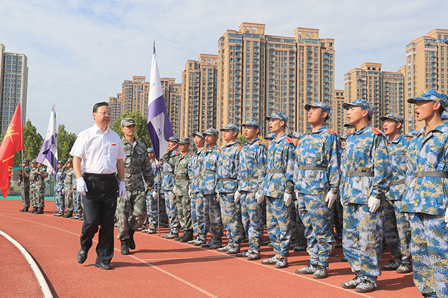 校长宁晓明在新生军训旅参谋长王志少校的陪同下,依次检阅了19个方队。