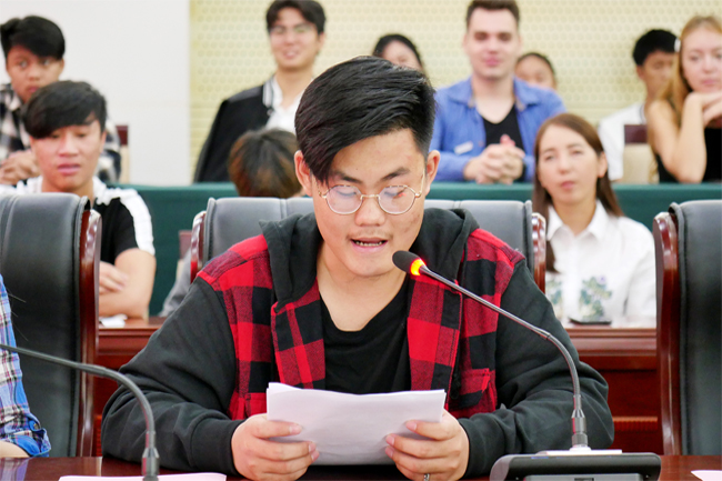 来自老挝的王星光同学作为学历留学生代表发言。他说,我哥哥在2002年就来到中国学习,现在老挝中组部工作,我一直以哥哥为榜样,希望自己可以为老挝和中国的友谊贡献一份力量。王星光表示,在江苏海洋大学这个大家庭中,自己会继续努力学习中文和中国文化,成为更好的自己。